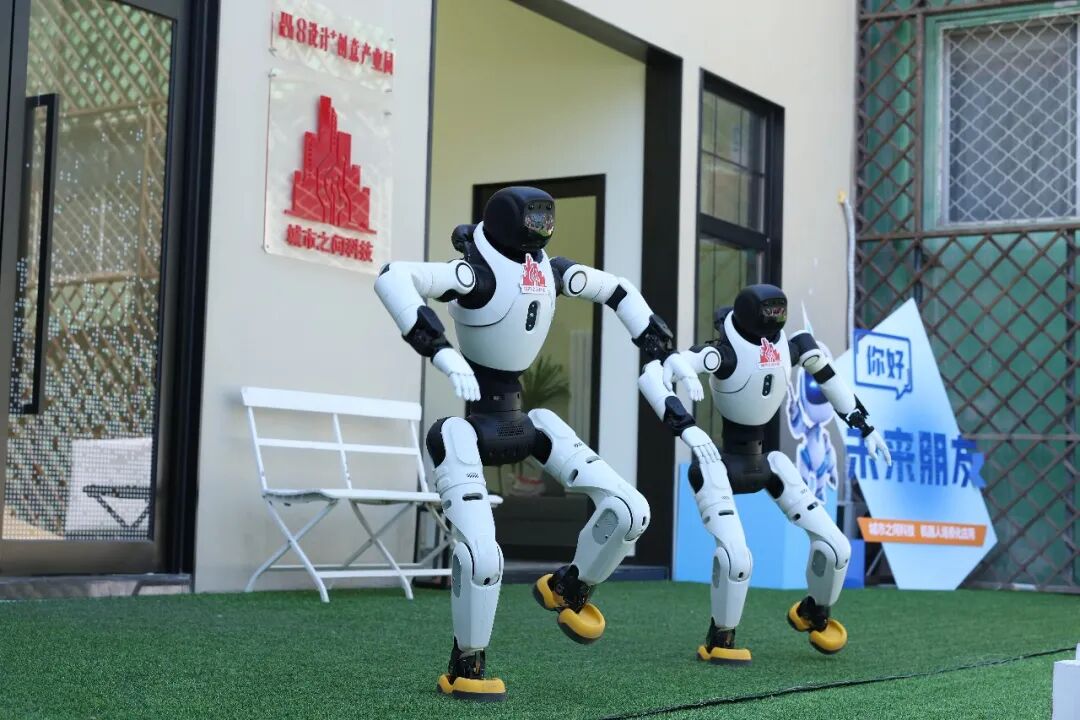 两台双足机器人步调协同、配合无间,舞步灵动自如、流畅潇洒,旋转、迈步一气呵成,那叫一个丝滑!